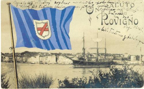 The coat of arms of Rovigno used before the Second World War, during the Italian rule (website), was basically the same as the modern one, differing in the artistical rendition. A blue flag (postcard, gonfalon) with the shield of the arms is recorded also in the 1890s, and was probably used before.