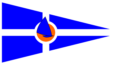 The burgee of the club is blue with a white cross and border and within a white disk an orange disk with a blue sailboat whose sails are protruding upwards.