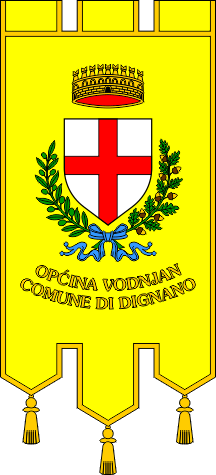 The ceremonial flag (photo, Nacional, 14 July 1999) is a yellow gonfalon with the coat of arms in the middle, topped with a mural crown and surrounded with an olive and an oak branch tied with a light blue ribbon. The name of the municipality is inscribed in two arched lines below in Croatian and Italian: "OPĆINA VODNJAN / COMUNE DI DIGNANO".