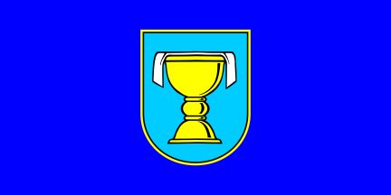The flag (municipal website) is in proportions 1:2, blue with the coat of arms, bordered yellow, in the middle.