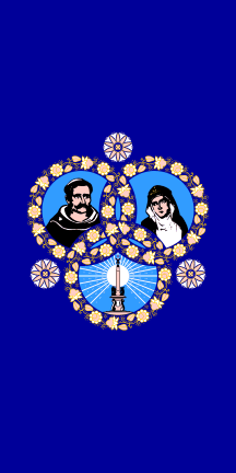 The ceremonial flag is vertical, with a golden fringe. On the reverse, three are richly ornamented roundels containing images of fra Luka Ibrišimović - the leader of the 1688 uprising against the Turks and the liberator of the city -, St. Theresa of Ávila - the patron saint of the town -, and the column of the Holy Trinity, erected in the town center in 1749, in the memory of 798 citizens killed by plague in 1739, when the town had only two thousand inhabitants.