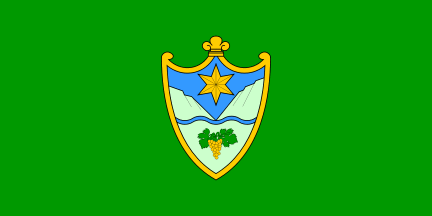 The ceremonial flag is a Bordeaux red gonfalon ending triangularly with a golden fringe, the coat of arms in the centre, the municipality name in two arches above and two golden grapevine branches below.