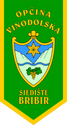 The coat of arms, designed by G. Blažević, from Novi Vinodolski, is in the traditional shape of the coat of arms of Bribir, adapting the contents, as "Azure a valley with steep mountains vert beneath it a barrulet wavy also azure and in the base a bunch of grapes or slipped and with two leaves vert and in the chief a mullet or".