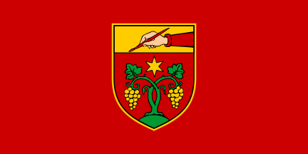 The coat of arms of the Municipality of Vinodol is in the shape of a triangular, heart-shaped, [horizontally] divided shield. In the shield chief coloured golden-yellow, taking up 1/4 of the width (height) of the shield, is an arm holding a paintbrush, while underneath is a Bordeaux red field of the shield, and in the centre of the shield in the Bordeaux red field - in top a golden-yellow Frankopan's star under which there are two stylized, interlaced golden-yellow bunches of grapes hanging from green branches and leaves of grapevine.