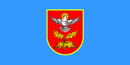 The coat of arms is prescribed as "... semicircular-shaped, the background colour being red. In the base of the shield is a cut oak stump coloured golden from which are growing two saplings. Above it, in the central part of the arms is a dove, wings spread, coloured white with its head towards dexter".