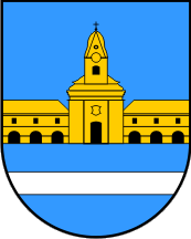 The coat of arms depicts the St. Theresa church. The building of the baroque church started in 1754, and it was the first stone structure built in the young town until four years earlier known as Friedrichsdorf (after colonel Friedrich Schmidt, Commander of the Gradiška Regiment).