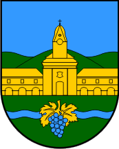 The town's coat of arms is of an upright shield shape. The top edge of the shield is straight and the bottom is semi-circular. The ratio of the width to height is 1:1.25. The coat of arms countains 4 colours: black, leaf green, cobalt blue and cadmium yellow (herceforward: black, green, blue and yellow). All elements within the shield are edged with thin black outlines, and the shield is bordered with a highlighted black line. In the centre of the top part of the shield is a depiction of the barque St. Theresa church, coloured yellow. To its left and right are depicted historical civic architecture - two one-storeyd buildings with arcades in the ground floor, coloured yellow. Above the church and buildings is a symmetrical composition of three hills colored green. The background of the top part is blue. In the middle of the lower part of the shield is a depiction of a stream - a wavy horizontal blue stripe. Above its central part is set a depiction of a blue bunch of grapes with two yellow leaves. The background of the lower part is green.