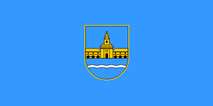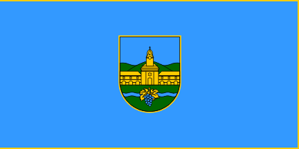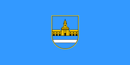 The Ministry issued its act regarding this flag on 24 October 1995, including the simple blazons that were made by the heraldic experts working for the Ministry: "Azure above a bar argent a church between two buildings all or". The flag is there explicitly stated to have a border around the coat of arms.