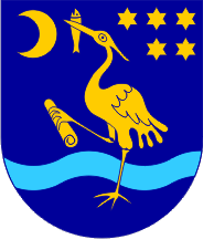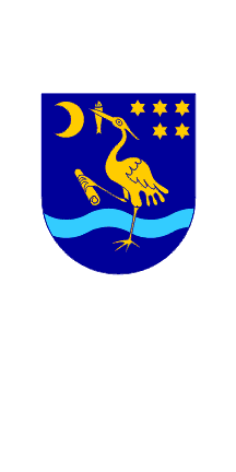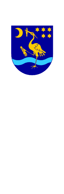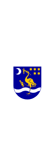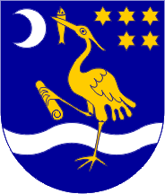 The coat of arms is in shape of semi-circular shield, Azure over a wavy bar argent a heron holding a fish in the beak and a scroll in dexter leg all or. Above it in dexter a crescent argent, in sinister five six-pointed stars in two rows (3:2) or. If the coat of arms is used with the name of the town, the text is inscribed in arch under the lower edge of the shield.