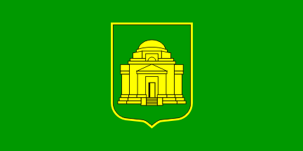 The flag is in proportions 1:2, green with the coat of arms, bordered yellow, in the middle.