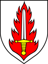 The coat of arms of Velika Ludina is "Argent a sword of the same erect hilted or inflamed gules". The inflamed sword is the attribute of Archangel St. Michael, to whom the parish church of Velika Ludina is consacrated.