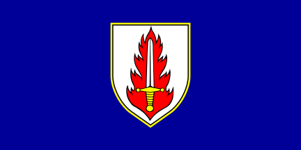 The flag is blue with the coat of arms, bordered yellow, in the middle.
