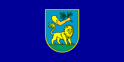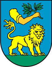 The coat of arms is described in Article 6 of the Statutes as a semi-circular shield divided into blue and green in ratio 6:1. The blue is named "turquoise blue", although that would make it way to greenish. The lion is described to be "standing with its head turned in the half-profile". The arm is described to be "an arm of a land worker with the shirt sleeve rolled up, holding a green laurel twig". Ströhl (Städte-Wappen von Ö-U, 1904) [stl04] describes a coat of arms only slightly different: the base is described brown, the colour of the lion's eyes is given as green, while the hand is clad in a red trimmed brown sleeve and holding an olive branch. Ströhl's drawing is not so much unlike the current design. This coat of arms is said to have been granted on 8 October 1888. Ströhl also notes that a flag was in use at the time, red-white-blue tricolor with the shield of the coat of arms in the centre; this must have been introduced after 1883 when the (Croatian) People's Party won the elections.