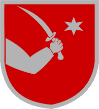 The coat of arms (municipal website) is "Gules a hand argent issuant from dexter holding a sabre and in sinister chief a mullet of the same". It is described in Article 7 of the Statutes in a rather longish fashion with a lots of repetition and explaining of its rather obvious symbolic