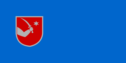 The flag (municipal website) is in proportions 1:2, blue, and further described in Article 8 of the Statutes as follows: "On its front side, closer to the hoist, is set