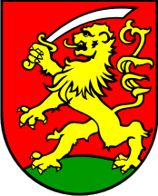 The coat of arms (municipal website) is the traditional coat of arms of the town, "Gules, on a mount vert a lion rampant or, holding in dexter a sabre argent hilted or above his head". The green mount represent the slope of the Bologora hills.