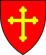 The coat of arms is described in Article 8 of the Statutes as "in shape of an ornamental shield colored red with a golden yellow trefoil cross in its centre, outlined with a black line".