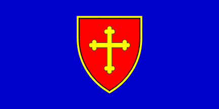 The flag is described in Article 9 of the Statutes as in proportions 1:2, blue with the coat of arms, bordered yellow, in the middle.