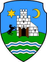On the arched cut dividing the shield into two fields, from the green, is issuing a fort - colored silver, with embattlements at the top, masoned, with open doors, loopholes and a cross above the doors. The loopholes, the interior of the doors and the cross are colored black. The doors wings are opened and arched at the top - colored brown.