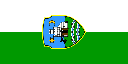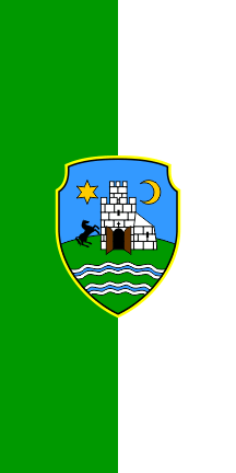 The flag is described as "vertically divided into green and white with the coat of arms, bordered yellow, in the middle". The flag is also used horizontally (photos, photo).