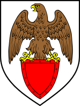 silver/white on a red shield standing a brown hawk armed