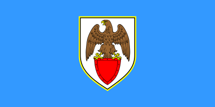 The flag is prescribed in Article 6 of the Statutes as in proportions 1:2, [light] blue with the coat of arms, bordered yellow, in the middle.