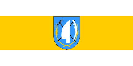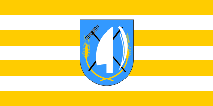 The flag is described as "rectangular with four golden-yellow and three white fields interlaced horizontally set starting with a golden yellow field and with the coat of arms in the middle".