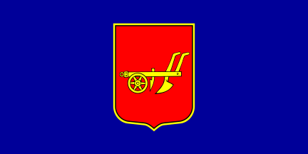 The flag is in proportions 1:2, blue with the coat of arms, bordered yellow, in the middle.