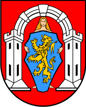 The coat of arms seemingly in official used today (municipal website), matches the legal description, except in a few points: the maiden is shown there in such position that the gown is not visible at all and she is barefoot, not in silver footwear.