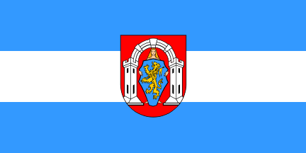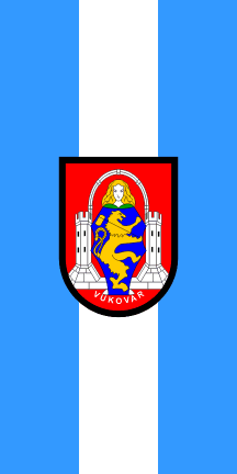 The flag of the Town of Vukovar is composed of two colors: light blue and white, with the coat of arms of the Town of Vukovar in the centre of it. The ratio of the width to the length of the flag is 1:2 (one to two). The colors are set horizontally in this order from the top: light blue, white, light blue. Each color makes 1/3 of the flag. The coat of arms of Vukovar is set in the centre of the flag, so that the top part, 1/6 of the coat of arms, enters into the top light blue field, and the bottom, 1/6 of the coat of arms, enters the bottom light blue field, while the central point of the coat of arms matches the crossing point of the flag diagonals.