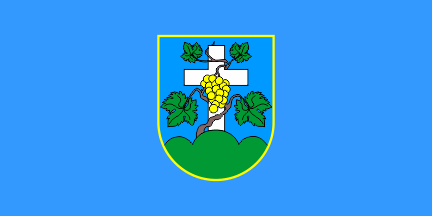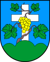 The coat of arms of Cestica (image) is "Azure a vine tree proper fructed or winding around a Latin cross argent issuant from a triple mount vert".