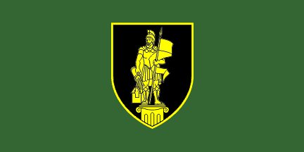 The flag is in proportions 1:2, green with the coat of arms, bordered yellow, in the middle.
