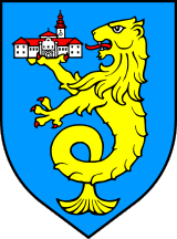 The coat of arms of Varaždinske Toplice is "Azure a sea-lion or rampant langued and armed gules holding in his dexter a castle argent roofed gules with a belfry".