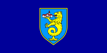 The flag is in proportions 1:2, dark blue with the coat of arms, bordered yellow, in the middle.