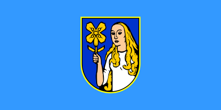 The ceremonial flag is a blue vertical flag, with the coat of arms offset towards bottom, surrounded with four degenia flower ornaments and four square tails, all edged with a thing yellow border. The municipality name is placed above the coat of arms.