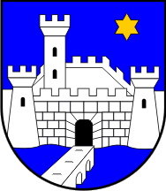 The coat of arms pictures the town with its walls and towers followed with a six-pointed star, originating from the emblem of the town in the pre-heraldic period. As is the case with many old towns on the Adriatic sea, the modernization of this emblem was slow and of many variants. The modern depiction of the coat of arms has been adopted recently based on the medieval (rectangular) reliefs preserved in the town walls.