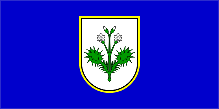The ceremonial flag is a blue golfalon with three rectangular tails containing oak ornaments, the coat of arms is in the middle and the name of the municipality above in two arches.