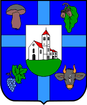 The coat of arms of Kravarsko (municipal website) is "Azure a cross celeste between a mushroom*, two acorns with an oak leaf, a bunch of grapes with a leaf and a cow's head affronty all proper in escutscheon argent a church roofed gules on a mount vert".