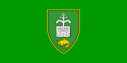 The flag (photo) is green (lighter than the green used in the coat of arms) with the coat of arms, bordered yellow, in the middle.