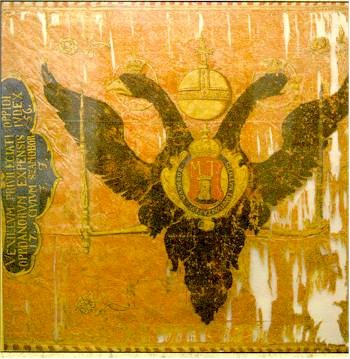 The flag is apparently of red silk, somewhat detoriated, semee with golden roses, showing a black double-headed eagle displayed, both heads crowned, beaked and haloed golden, membered also golden holding in the right a sceptre and in the left a sword, between the two heads is a golden orb. On the breast of the eagle is on a golden cartouche and surrounded with a blue ribbon iscribed golden (probably the full ceremonial name of the town in Latin) crowned with a golden crown is the coat of arms of the town, "Gules a tower argent issuant from rocks proper between two thorny bushes and in chief letters 'MT' [Maria Theresa] argent'. Along the hoist is a blue cartouche inscribed with yellow in four lines: "Vexillum privii eciati oppidi / oppidanorum expensis iudex / 17. civivm Szamobor 56. / J. J. (?)".