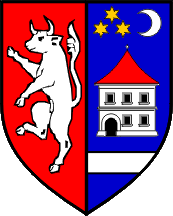 The coat of arms of Velika Gorica is "Sable, an oxen rampant argent holding in forelegs a house of the second roofed gules, in chief, sinister a crescent of the second, dexter three mullets or one above two".