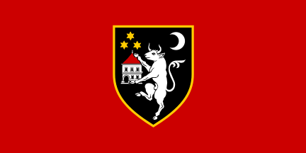 The flag is red with the coat of arms, bordered yellow, in the middle.