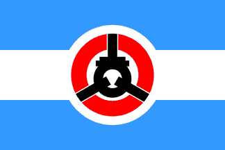 The house flag of Brodospas, as shown by Isaić [isa01], is a blue-white-blue triband with a with disk overall containing a red annulet with dark blue link rings.