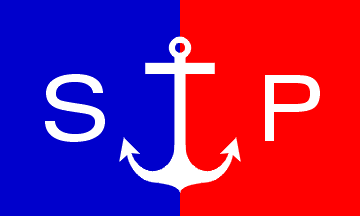 The house flag of Slobodna plovidba Dubrovnik, as shown by Isaić [isa01], is vertically divided blue-red with a white anchor flanked by the white initials "SP".