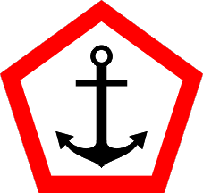 Red bordered white pentagon with black anchor in the middle. The fin carries an adapted national flag. Cochrane and Elliott (1998) show it as a 1:2 national flag.