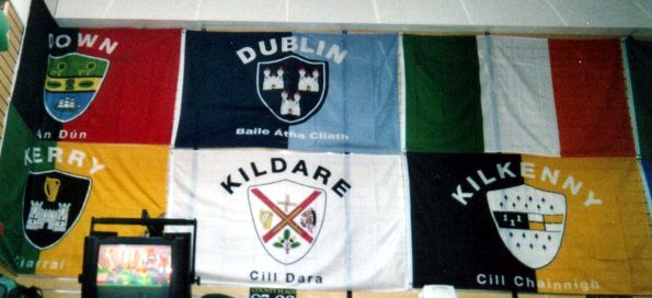 When I visited souvenir shop in Dublin in May 2005 I saw flags of all the counties showing mostly bicolors with a county shield and the county name written in Gaelic written above and in English below. Here is an example: