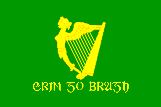 On p. 166, McCracken describes another flag that is also shown in G.A. Hayes-McCoy, plate iv, and which was carried by an Irish commando - it is unclear whether it was the first or second. This is an uninscribed Green Flag with a harp of the 'winged-maiden' type above a wreath of shamrock in gold. An unusual feature is that the harp is displaced towards the fly. This flag remained in South Africa for some time and was displayed at a public meeting in Pretoria held to support Irish independence in May 1921. McCracken (p. 166) quotes from a contemporary report as follows: