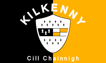 A black and amber vertical bicolour (the county colours) with a centred shield, horizontally divided in three, the top and bottom ermine, the middle showing three white shapes (sheaves?) on black, and quartered white and amber. The name KILKENNY is arched above, and Cill Chainnigh below.