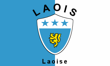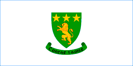 A white flag with a green shield bearing a gold lion rampant and three stars in the chief, and below a green banner reading "CONTAE LAOISE" (Laois County) in a Celtic script.