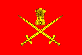 Red with two crossed swords and the Ashoka lions emblem above them, all